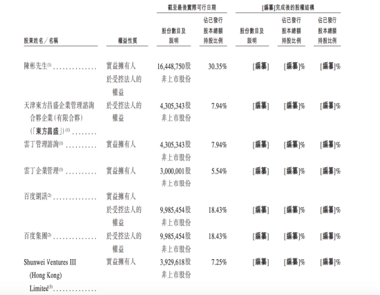 IPO前股权结构浮现,独创东谈主陈彬通过径直及盘曲捏股统统限度30.35%股权,为公司骨子限度东谈主;百度集团统统捏股18.43%,为最大外部投资方;顺为成本捏股7.25%,海纳华捏股6.49%,中关村科学城捏股5.71%。