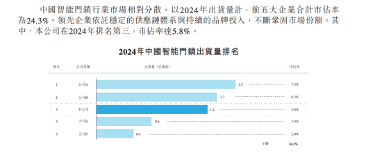 2024年该公司在中国内地的智能锁出货量达到120万套,位列第三,市集占有率为5.8%。而名轮番一的企业在该年度出货量为150万套,市集占有率为7.3%。